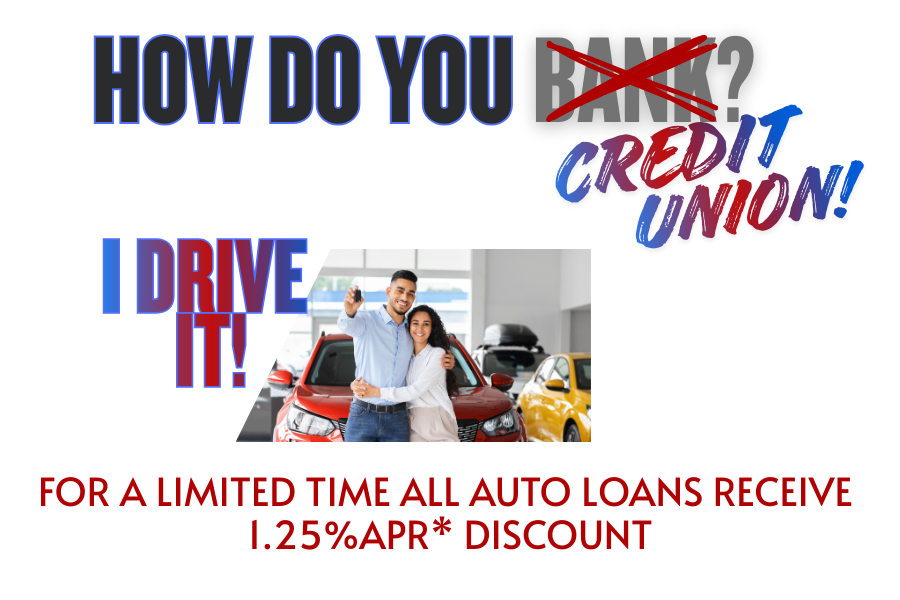 All AUTO Loans (new, used, or drive 4 less) approved and closed during this promotion automatically receive a Maximum 1.25%* APR Discount off your qualifying APR*